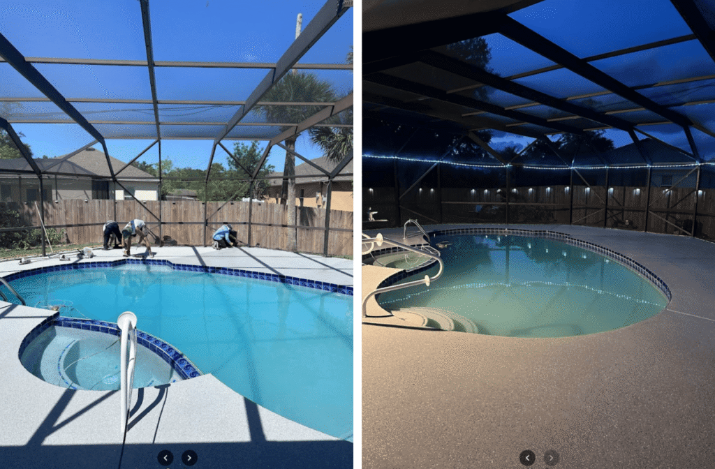 Floortek resurfaced our pool deck. They had 4 solid days of grunt work, detail, skill and precision with the application. Remarkably, even at the end of the day they were smiling and joking with each other. And the pool deck is now high end resort worthy. Thank you from Jim and Debbie.